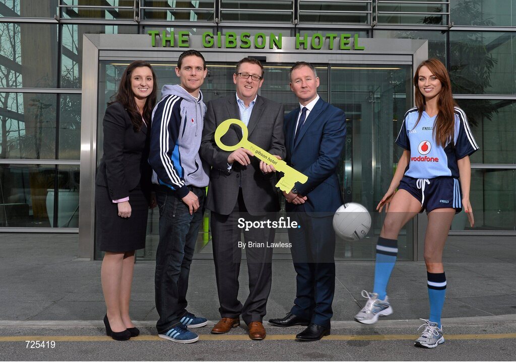 28 February 2013; The Gibson Hotel has been named as the hotel of choice for the Dublin senior football team. At the announcement of the partnership are, from left, Doireann O'Neill, Marketing Executive, The Gibson Hotel, Dublin goalkeeper Stephen Cluxton, Adrian McLaughlin, General Manager, The Gibson Hotel, Dublin football manager Jim Gavin, and model Daniella Moyles. The Gibson Hotel, Point Village, Dublin. Picture credit: Brian Lawless / SPORTSFILE