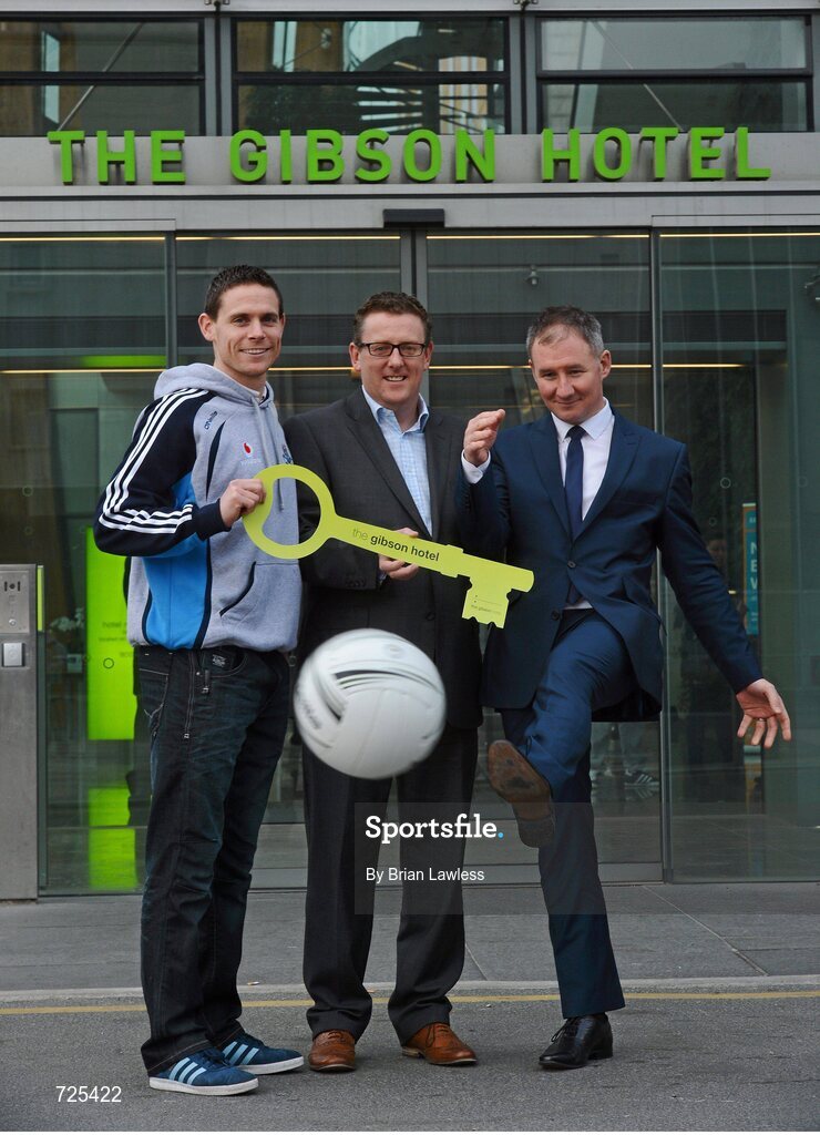 28 February 2013; The Gibson Hotel has been named as the hotel of choice for the Dublin senior football team. At the announcement of the partnership are, Adrian McLaughlin, General Manager, The Gibson Hotel, centre, with Dublin football manager Jim Gavin, and Dublin goalkeeper Stephen Cluxton, left. The Gibson Hotel, Point Village, Dublin. Picture credit: Brian Lawless / SPORTSFILE