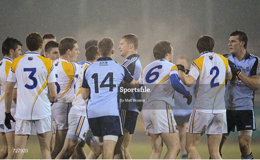 6 March 2013; Dublin and Longford players tussle off the ball during the game. Cadbury Leinster GAA Football U21 Championship, Quarter-Final, Dublin v Longford, Parnell Park, Dublin. Picture credit: Matt Browne / SPORTSFILE