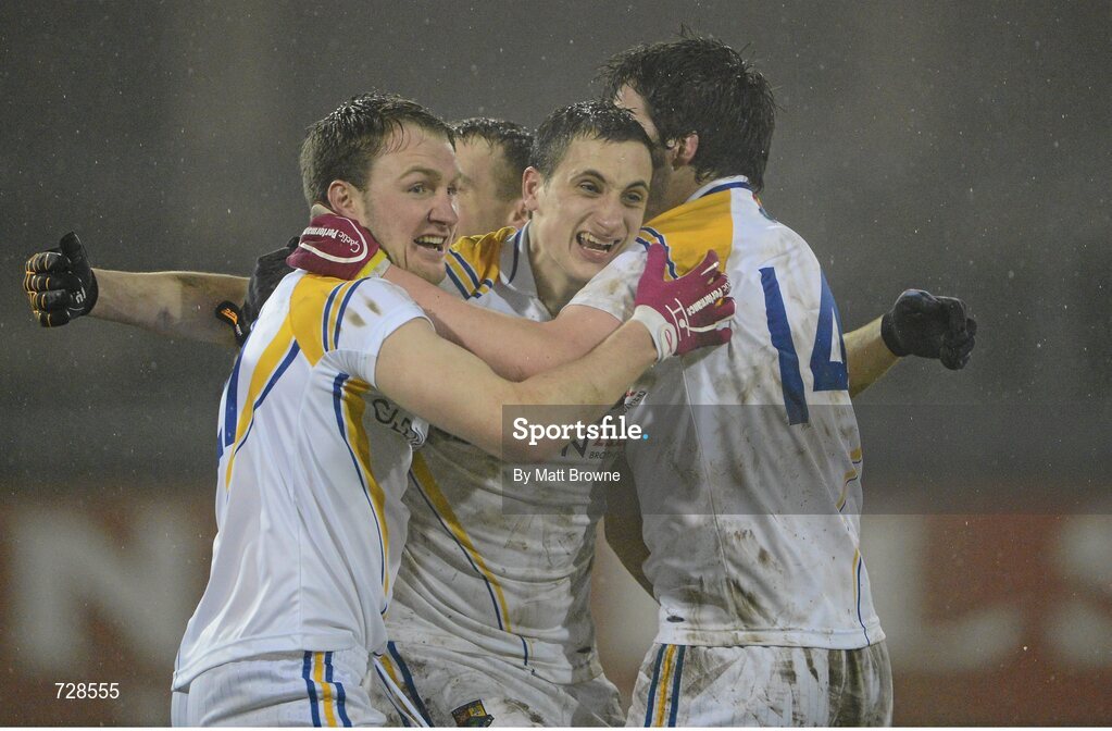 6 March 2013; Longford's Darren Gallagher, centre, celebrates with Dylan Quinn, left, and Mark Hughes, right, after the final whistle. Cadbury Leinster GAA Football U21 Championship, Quarter-Final, Dublin v Longford, Parnell Park, Dublin. Picture credit: Matt Browne / SPORTSFILE