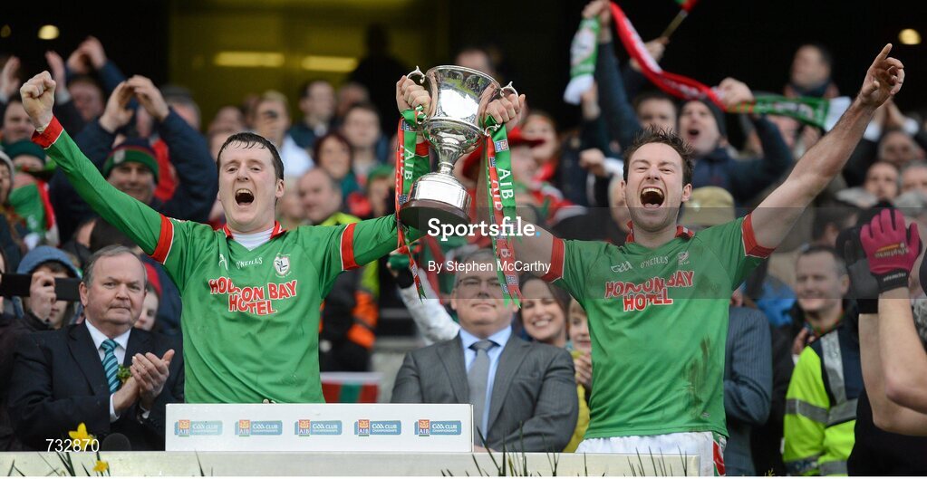 17 March 2013; St Brigid's joint captains Gearóid Cunniffe, left, and Darragh Donnelly lift the Andy Merrigan cup. AIB GAA Football All-Ireland Senior Club Championship Final, Ballymun Kickhams, Dublin, v St Brigid's, Roscommon. Croke Park, Dublin. Picture credit: Stephen McCarthy / SPORTSFILE