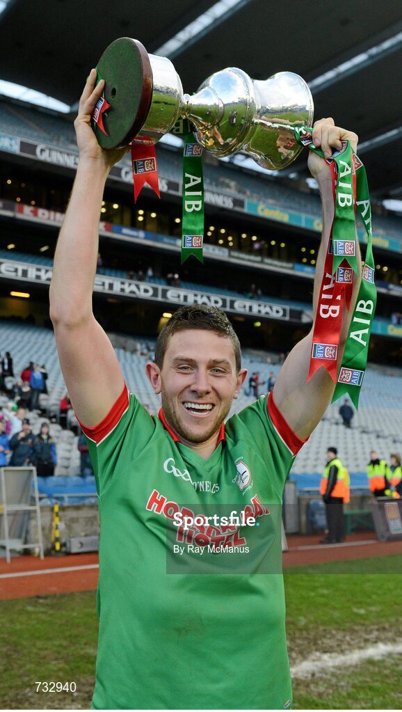 17 March 2013; Karol Mannion, St Brigid's, with the Andy Merrigan cup. AIB GAA Football All-Ireland Senior Club Championship Final, Ballymun Kickhams, Dublin, v St Brigid's, Roscommon. Croke Park, Dublin. Picture credit: Ray McManus / SPORTSFILE
