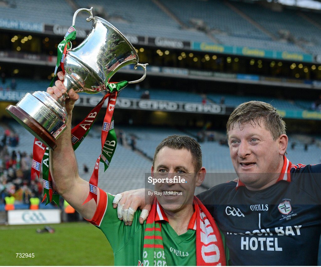 17 March 2013; St Brigid's players Frankie Dolan and Shane Curran with the Andy Merrigan cup. AIB GAA Football All-Ireland Senior Club Championship Final, Ballymun Kickhams, Dublin, v St Brigid's, Roscommon. Croke Park, Dublin. Picture credit: Ray McManus / SPORTSFILE