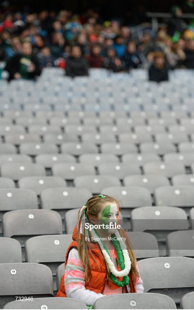 17 March 2013; Chloe Kelly, age 9, from Balbriggan, Co. Dublin, watches on during the game. AIB GAA Football All-Ireland Senior Club Championship Final, Ballymun Kickhams, Dublin, v St Brigid's, Roscommon. Croke Park, Dublin. Picture credit: Stephen McCarthy / SPORTSFILE