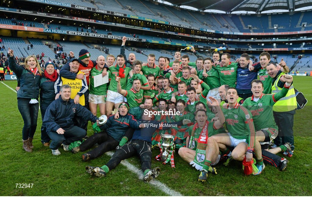 17 March 2013; St Brigid's players and officials celebrate with the Andy Merrigan cup. AIB GAA Football All-Ireland Senior Club Championship Final, Ballymun Kickhams, Dublin, v St Brigid's, Roscommon. Croke Park, Dublin. Picture credit: Ray McManus / SPORTSFILE