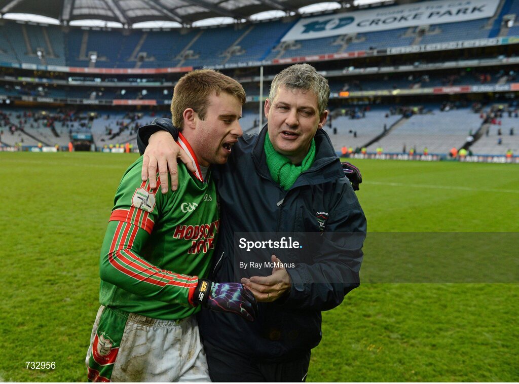17 March 2013; Damien Kelleher celebrates with St Brigid's manager Kevin McStay. AIB GAA Football All-Ireland Senior Club Championship Final, Ballymun Kickhams, Dublin, v St Brigid's, Roscommon. Croke Park, Dublin. Picture credit: Ray McManus / SPORTSFILE