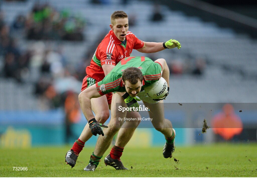 17 March 2013; Senan Kilbride, St Brigid's, in action against Alan Hubbard, Ballymun Kickhams. AIB GAA Football All-Ireland Senior Club Championship Final, Ballymun Kickhams, Dublin, v St Brigid's, Roscommon. Croke Park, Dublin. Picture credit: Stephen McCarthy / SPORTSFILE