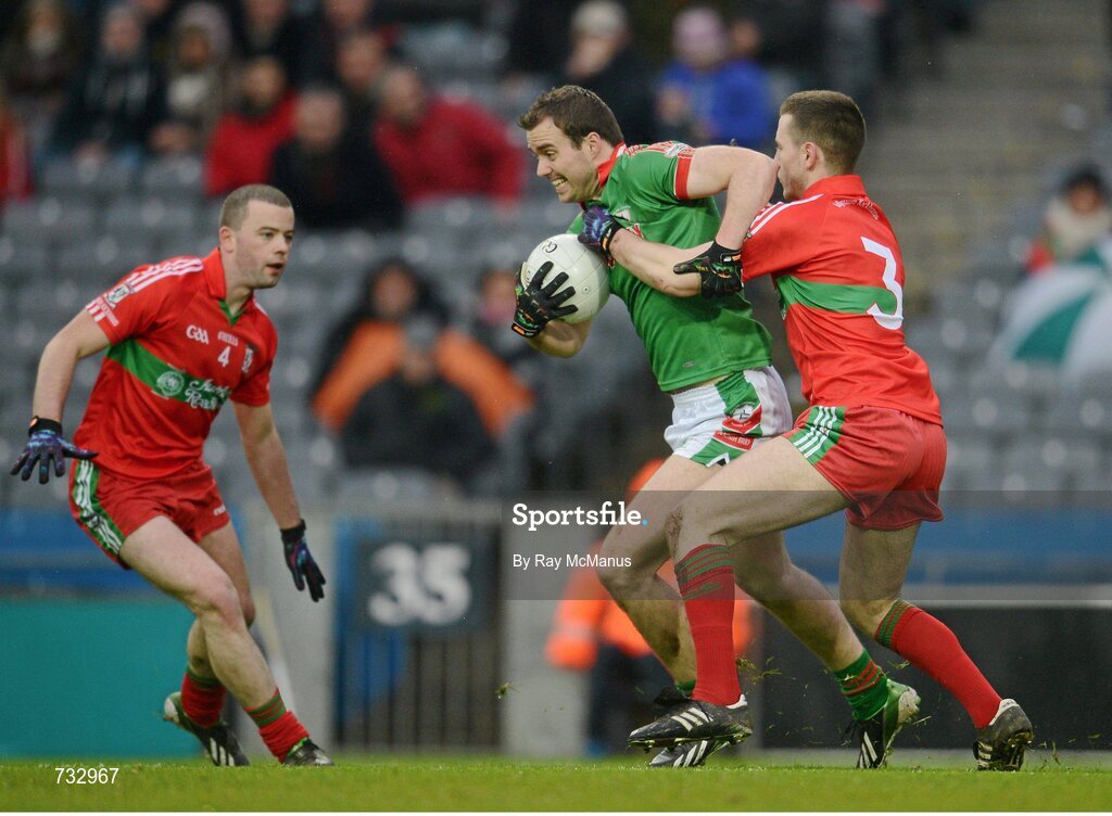 17 March 2013; Senan Kilbride, St Brigid's, in action against Enda Dolan, left, and Seán George, Ballymun Kickhams. AIB GAA Football All-Ireland Senior Club Championship Final, Ballymun Kickhams, Dublin, v St Brigid's, Roscommon. Croke Park, Dublin. Picture credit: Ray McManus / SPORTSFILE