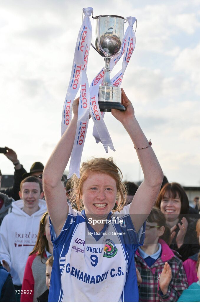 20 March 2013; Glenamaddy Community School captain Louise Ward lifts the cup after victory over St Paul's High School. Tesco HomeGrown Post Primary School Junior A Final, Glenamaddy Community School, Co. Galway v St Paul's High School, Co. Armagh, Glenamaddy GAA Club, Galway. Picture credit: Diarmuid Greene / SPORTSFILE