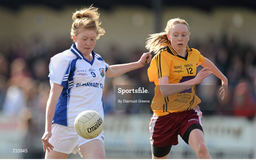 20 March 2013; Louise Ward, Glenamaddy Community School, in action against Maria Murphy, St Paul's High School. Tesco HomeGrown Post Primary School Junior A Final, Glenamaddy Community School, Co. Galway v St Paul's High School, Co. Armagh, Glenamaddy GAA Club, Galway. Picture credit: Diarmuid Greene / SPORTSFILE