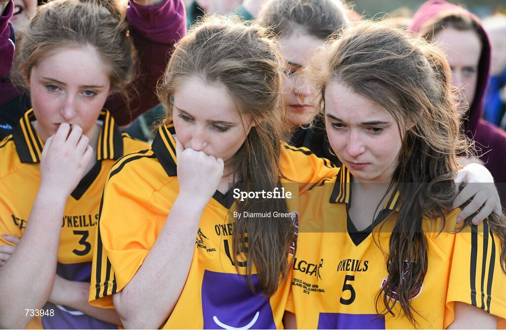 20 March 2013; St Paul's High School players Emma King, left, Sarah King, centre, and Shauna McCrink show their disappointment after defeat to Glenamaddy Community School. Tesco HomeGrown Post Primary School Junior A Final, Glenamaddy Community School, Co. Galway v St Paul's High School, Co. Armagh, Glenamaddy GAA Club, Galway. Picture credit: Diarmuid Greene / SPORTSFILE