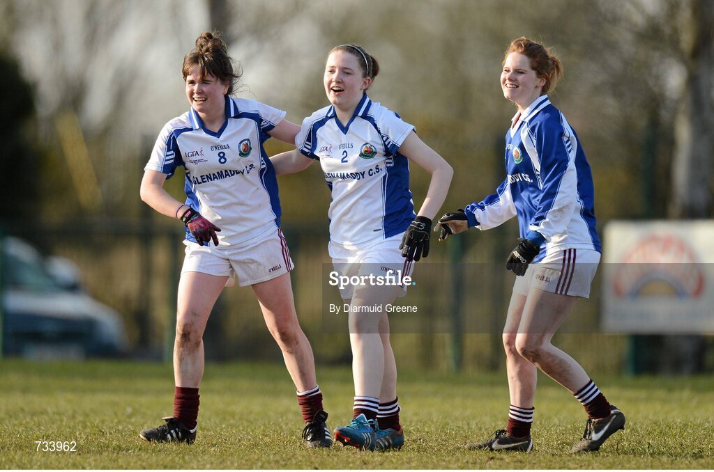 20 March 2013; Nicola Ward, left, Leanne Davis, centre, and Maria Treacy, Glenamaddy Community School, celebrate after victory over St Paul's High School. Tesco HomeGrown Post Primary School Junior A Final, Glenamaddy Community School, Co. Galway v St Paul's High School, Co. Armagh, Glenamaddy GAA Club, Galway. Picture credit: Diarmuid Greene / SPORTSFILE