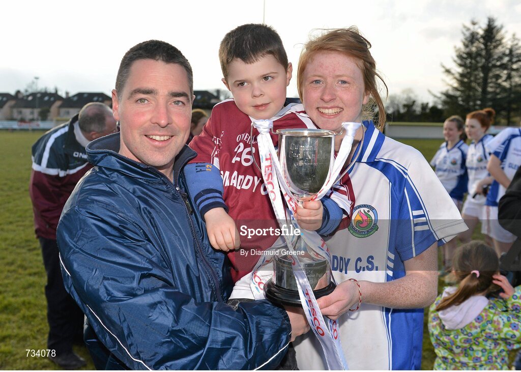 20 March 2013; Glenamaddy Community School captain Louise Ward along with manager John Kennedy and his son Conor, aged 5, after the game. Tesco HomeGrown Post Primary School Junior A Final, Glenamaddy Community School, Co. Galway v St Paul's High School, Co. Armagh, Glenamaddy GAA Club, Galway. Picture credit: Diarmuid Greene / SPORTSFILE