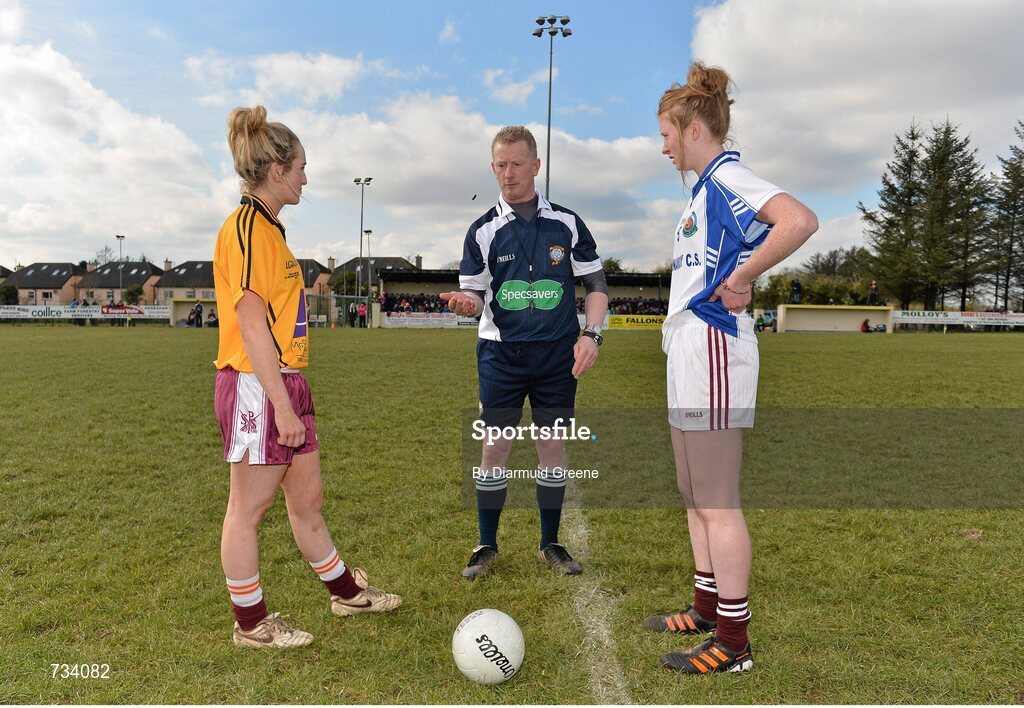 20 March 2013; Referee Paul Fahy performs the pre-match coin toss in the company of St Paul's High School captain Shauna Finnegan, left, and Glenamaddy Community School captain Louise Ward. Tesco HomeGrown Post Primary School Junior A Final, Glenamaddy Community School, Co. Galway v St Paul's High School, Co. Armagh, Glenamaddy GAA Club, Galway. Picture credit: Diarmuid Greene / SPORTSFILE