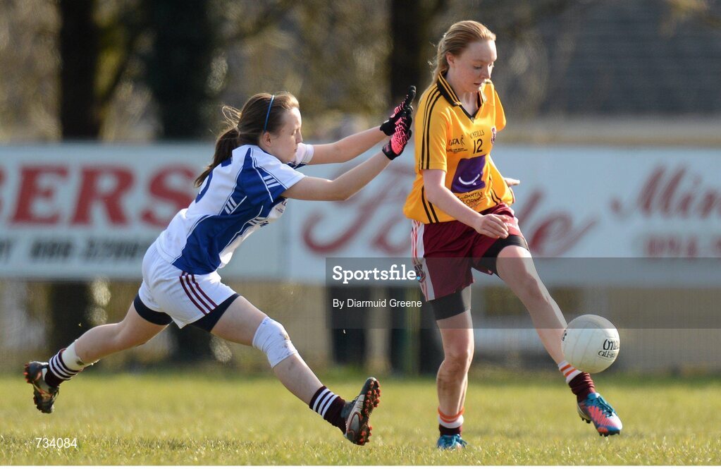 20 March 2013; Maria Murphy, St Paul's High School, in action against Amy Keegan Conneely, Glenamaddy Community School. Tesco HomeGrown Post Primary School Junior A Final, Glenamaddy Community School, Co. Galway v St Paul's High School, Co. Armagh, Glenamaddy GAA Club, Galway. Picture credit: Diarmuid Greene / SPORTSFILE
