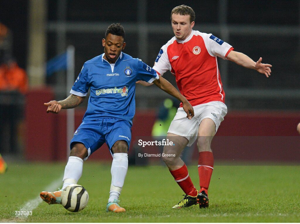 30 March 2013; Patrick Nzuzi, Limerick, in action against Conan Byrne, St. Patrick’s Athletic. Airtricity League Premier Division, Limerick FC v St. Patrick’s Athletic, Thomond Park, Limerick. Picture credit: Diarmuid Greene / SPORTSFILE