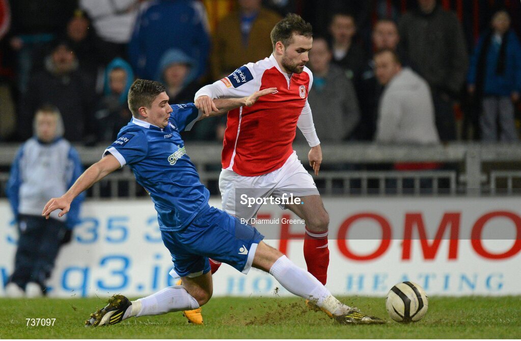30 March 2013; Christy Fagan, St. Patrick’s Athletic, in action against Shaun Kelly, Limerick. Airtricity League Premier Division, Limerick FC v St. Patrick’s Athletic, Thomond Park, Limerick. Picture credit: Diarmuid Greene / SPORTSFILE