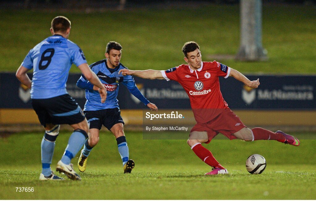1 April 2013; Aaron Greene, Sligo Rovers, shoots to score his side's first goal despite the attention of Gary Burke and Robbie Creevy, 8, UCD. Airtricity League Premier Division, UCD v Sligo Rovers, UCD Bowl, Belfield, Dublin. Picture credit: Stephen McCarthy / SPORTSFILE