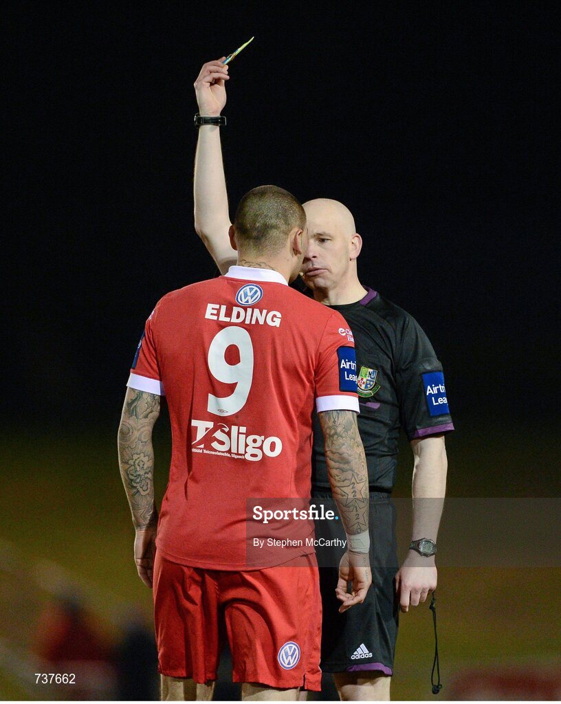 1 April 2013; Anthony Elding, Sligo Rovers, receives a yellow card from referee Dave McKeon. Airtricity League Premier Division, UCD v Sligo Rovers, UCD Bowl, Belfield, Dublin. Picture credit: Stephen McCarthy / SPORTSFILE
