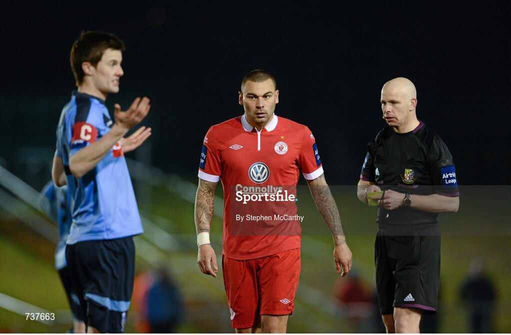 1 April 2013; Anthony Elding, Sligo Rovers, after receiving a yellow card from referee Dave McKeon. Airtricity League Premier Division, UCD v Sligo Rovers, UCD Bowl, Belfield, Dublin. Picture credit: Stephen McCarthy / SPORTSFILE