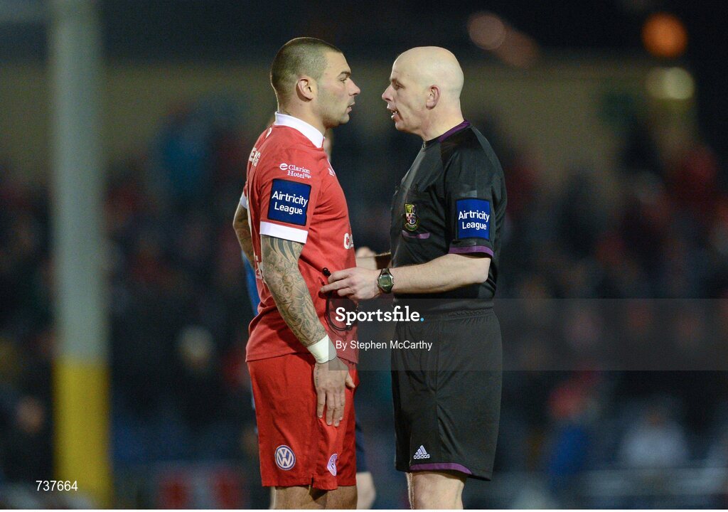 1 April 2013; Anthony Elding, Sligo Rovers, with referee Dave McKeon. Airtricity League Premier Division, UCD v Sligo Rovers, UCD Bowl, Belfield, Dublin. Picture credit: Stephen McCarthy / SPORTSFILE