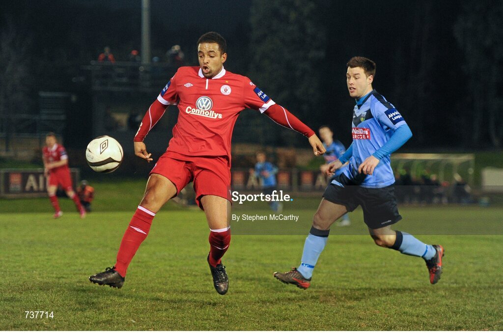 1 April 2013; Kieran Djilali, Sligo Rovers, in action against Gareth Matthews, UCD. Airtricity League Premier Division, UCD v Sligo Rovers, UCD Bowl, Belfield, Dublin. Picture credit: Stephen McCarthy / SPORTSFILE