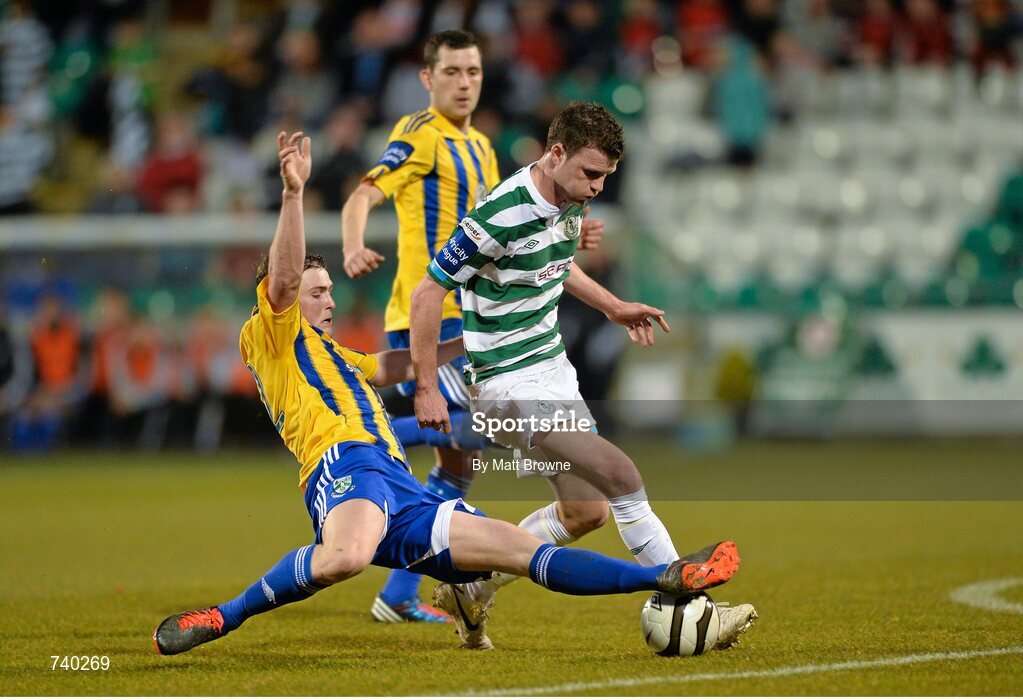 12 April 2013; Ciaran Kilduff, Shamrock Rovers, in action against Peter Thomas, Bray Wanderers. Airtricity League Premier Division, Shamrock Rovers v Bray Wanderers, Tallaght Stadium, Tallaght, Co. Dublin. Picture credit: Matt Browne / SPORTSFILE
