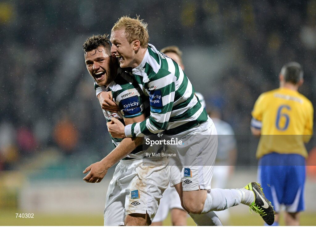 12 April 2013; James Chambers, Shamrock Rovers, celebrates after scoring the 5th goal against Bray Wanderers with team-mate Derek Foran. Airtricity League Premier Division, Shamrock Rovers v Bray Wanderers, Tallaght Stadium, Tallaght, Co. Dublin. Picture credit: Matt Browne / SPORTSFILE