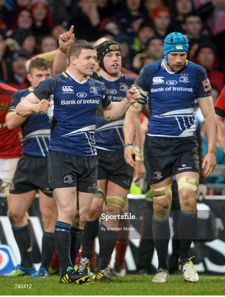 13 April 2013; Leinster's Brian O'Driscoll celebrates victory at the end of the game. Celtic League 2012/13, Round 20, Munster v Leinster, Thomond Park, Limerick. Picture credit: Brendan Moran / SPORTSFILE