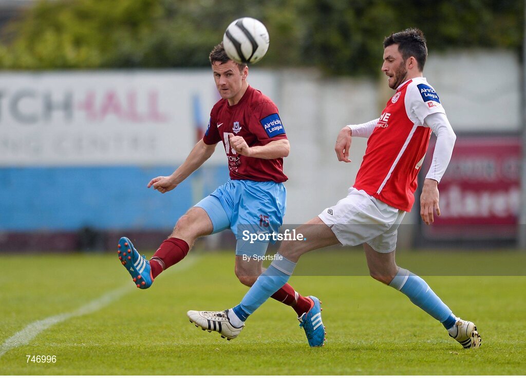 6 May 2013; David Cassidy, Drogheda United, in action against Killian Brennan, St. Patrick’s Athletic. Airtricity League Premier Division, Drogheda United v St. Patrick’s Athletic, Hunky Dorys Park, Drogheda, Co. Louth. Photo by Sportsfile