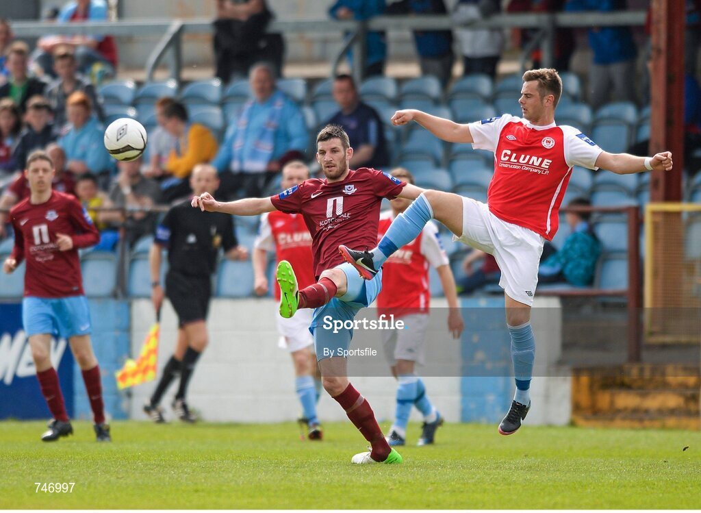 6 May 2013; Greg Bolger, St. Patrick’s Athletic, in action against Gavin Brennan, Drogheda United. Airtricity League Premier Division, Drogheda United v St. Patrick’s Athletic, Hunky Dorys Park, Drogheda, Co. Louth. Photo by Sportsfile
