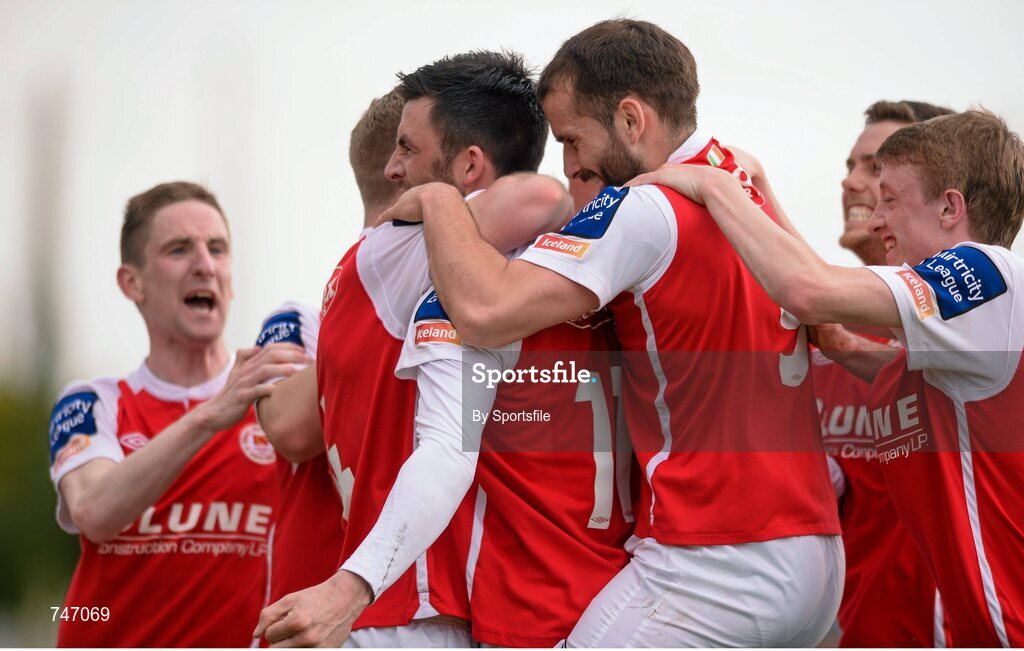 6 May 2013; St. Patrick’s Athletic's Killian Brennan, centre, is congratulated by team-mates after scoring his side's second goal. Airtricity League Premier Division, Drogheda United v St. Patrick’s Athletic, Hunky Dorys Park, Drogheda, Co. Louth. Photo by Sportsfile