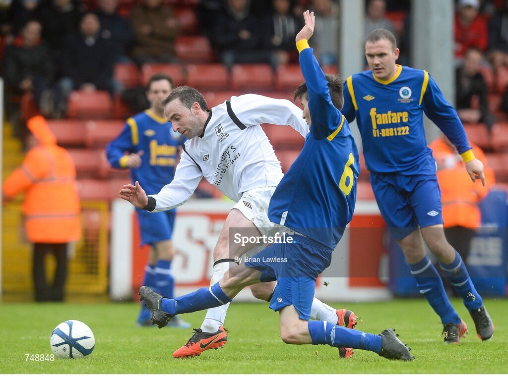 12 May 2013; Karl Caulfield, Avondale United, in action against Peter Darcy, Bluebell United. FAI Umbro Intermediate Cup Final, Bluebell United v Avondale United, Richmond Park, Dublin. Picture credit: Brian Lawless / SPORTSFILE