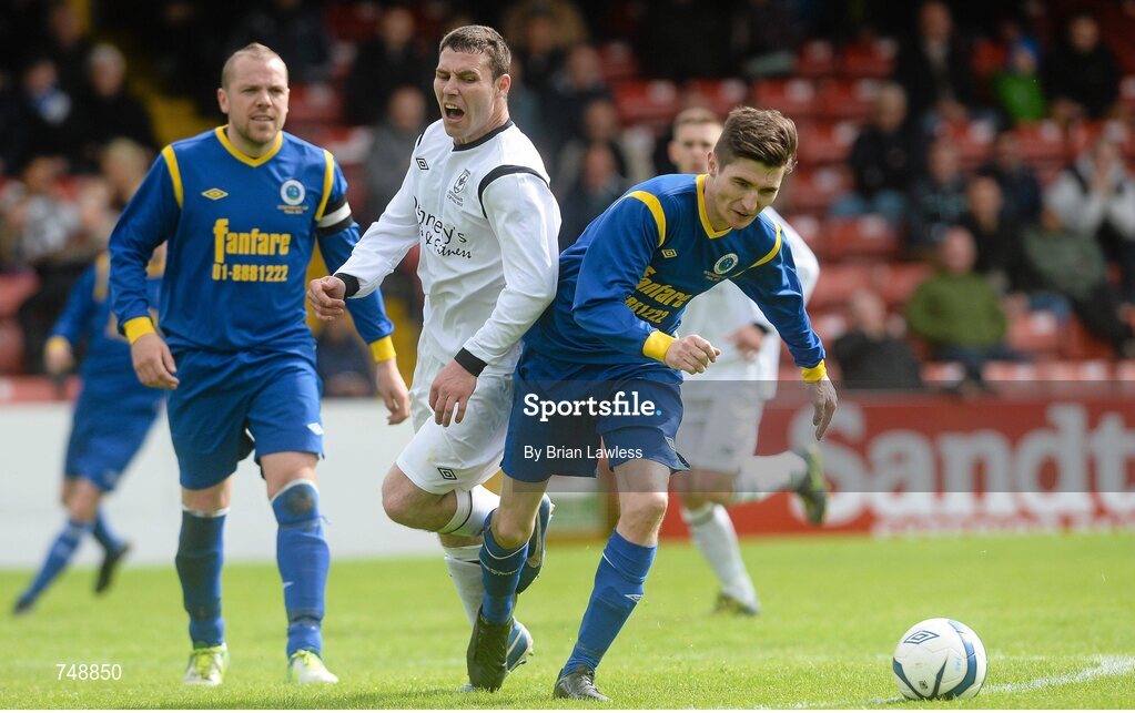 12 May 2013; Peter Darcy, Bluebell United, in action against Karl Caulfield, Avondale United. FAI Umbro Intermediate Cup Final, Bluebell United v Avondale United, Richmond Park, Dublin. Picture credit: Brian Lawless / SPORTSFILE