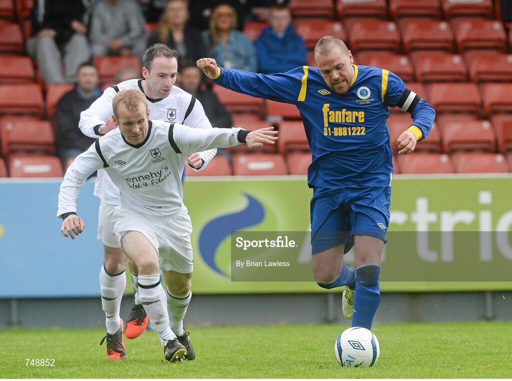 12 May 2013; Glen Madden, Bluebell United, in action against Michael Mulcrony and Karl Caulfield, behind, Avondale United. FAI Umbro Intermediate Cup Final, Bluebell United v Avondale United, Richmond Park, Dublin. Picture credit: Brian Lawless / SPORTSFILE