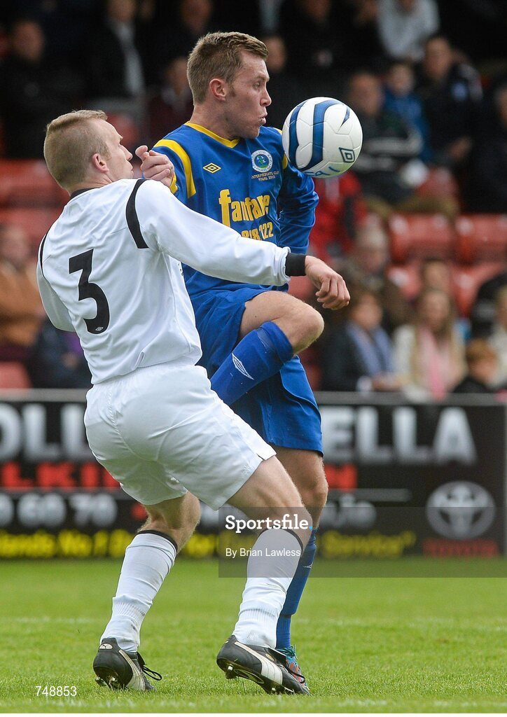 12 May 2013; Tony Griffith, Bluebell United, in action against David Spratt, Avondale United. FAI Umbro Intermediate Cup Final, Bluebell United v Avondale United, Richmond Park, Dublin. Picture credit: Brian Lawless / SPORTSFILE