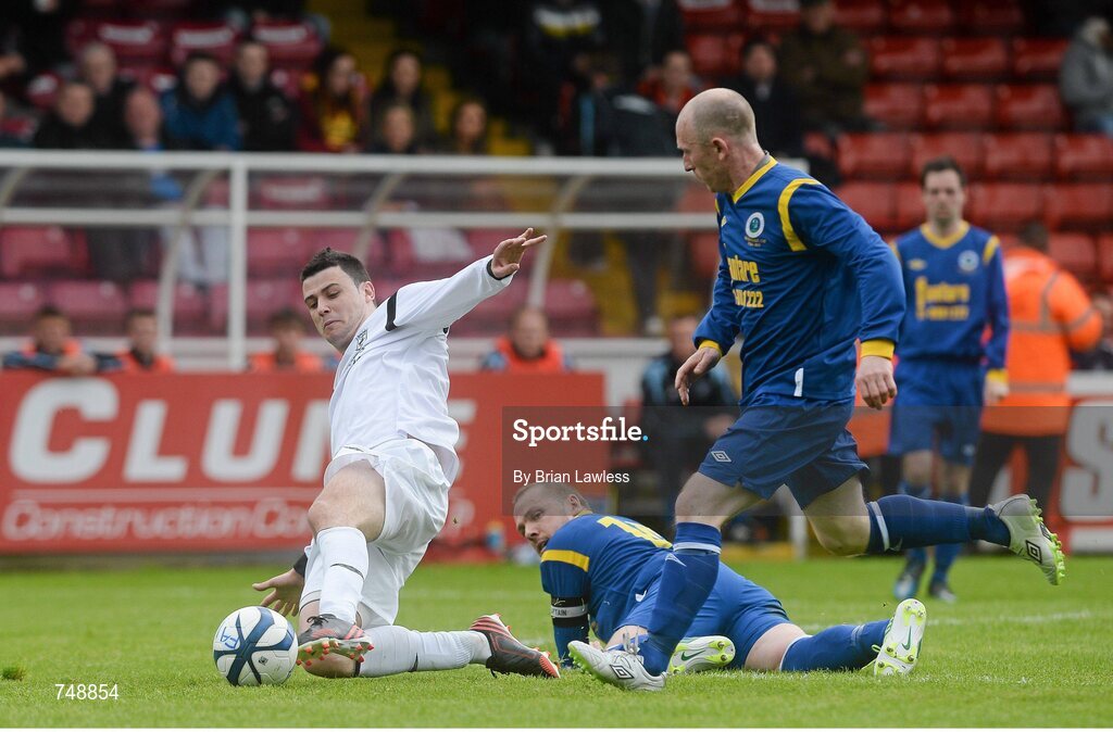 12 May 2013; Danny Long, Avondale United, in action against Trevor Molloy, right, and Glen Madden, Bluebell United. FAI Umbro Intermediate Cup Final, Bluebell United v Avondale United, Richmond Park, Dublin. Picture credit: Brian Lawless / SPORTSFILE