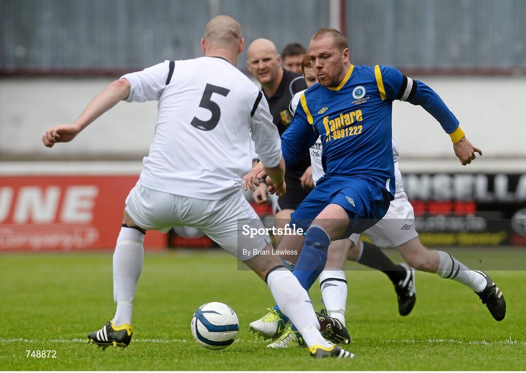 12 May 2013; Glen Madden, Bluebell United, in action against Mark Horgan, Avondale United. FAI Umbro Intermediate Cup Final, Bluebell United v Avondale United, Richmond Park, Dublin. Picture credit: Brian Lawless / SPORTSFILE