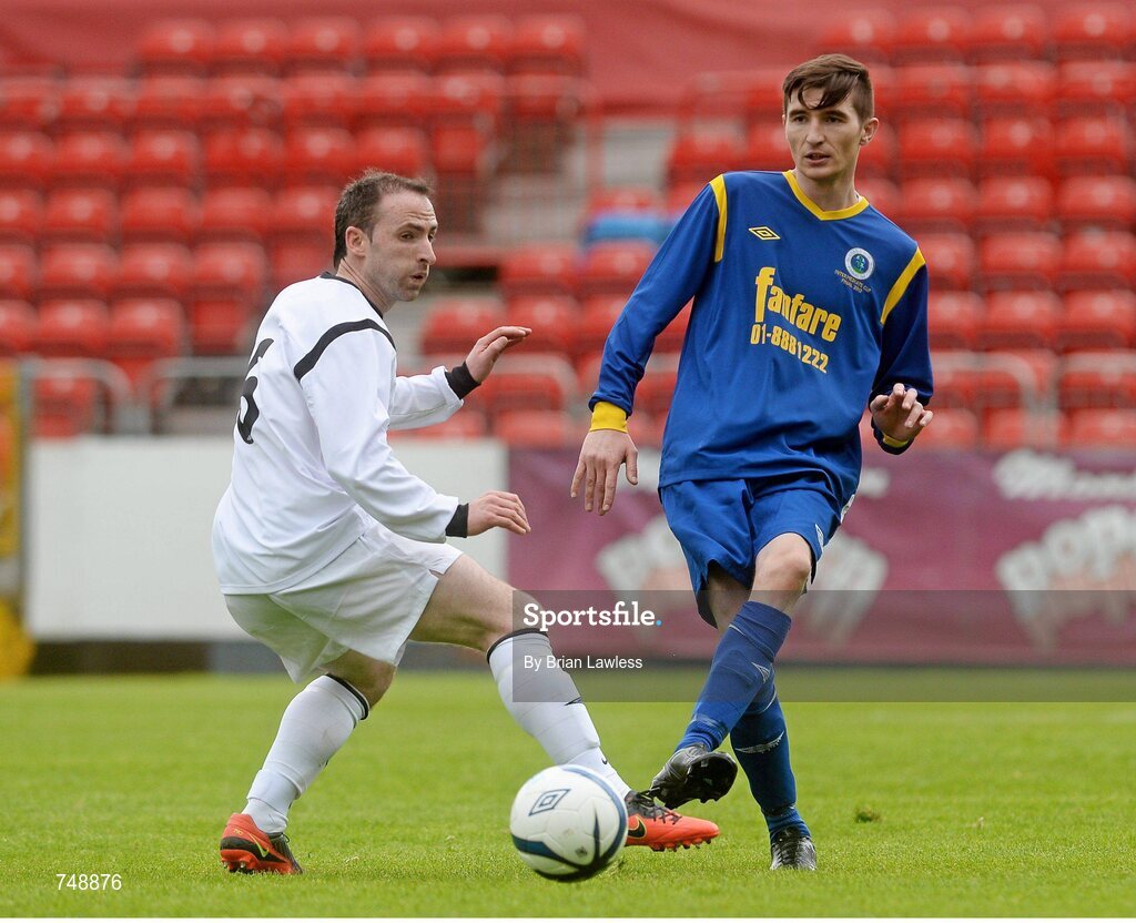12 May 2013; Peter Darcy, Bluebell United, in action against Karl Caulfield, Avondale United. FAI Umbro Intermediate Cup Final, Bluebell United v Avondale United, Richmond Park, Dublin. Picture credit: Brian Lawless / SPORTSFILE