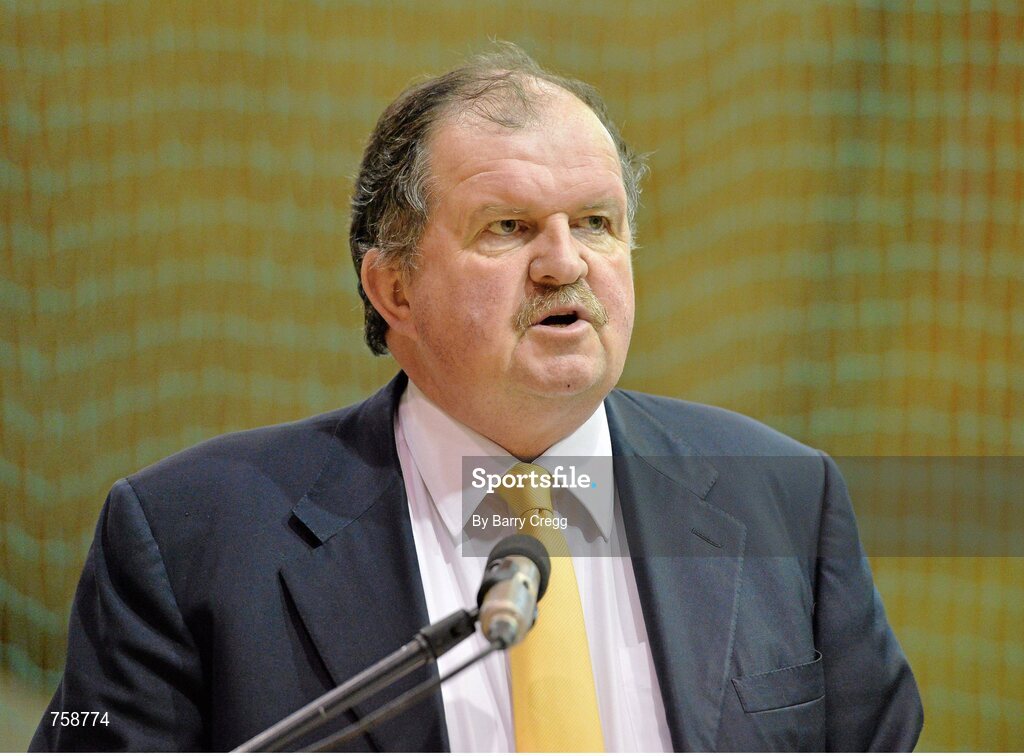 8 June 2013; Bernard O'Byrne, Chief Executive, Basketball Ireland, speaking to the audience during the awards. Basketball Ireland Annual Awards 2012/2013, National Basketball Arena, Tallaght, Dublin. Picture credit: Barry Cregg / SPORTSFILE