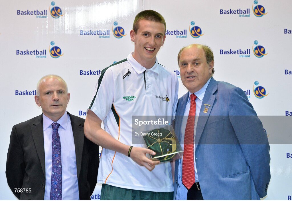 8 June 2013; Liam Pettigrew, St. Malachy's College, Belfast, Co. Antrim, is presented with his Under 18 Boy's International Cap by Ger Tarrant, I.A.C, left, and Gerry Kelly, President of Basketball Ireland. Basketball Ireland Annual Awards 2012/2013, National Basketball Arena, Tallaght, Dublin. Picture credit: Barry Cregg / SPORTSFILE