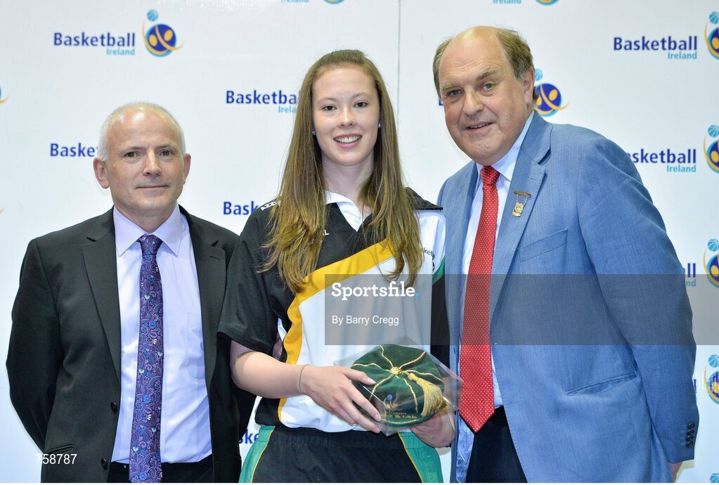 8 June 2013; Aoife Tiernan, Kildare, is presented with her Under 16 Girl's International Cap by Ger Tarrant, I.A.C, left, and Gerry Kelly, President of Basketball Ireland. Basketball Ireland Annual Awards 2012/2013, National Basketball Arena, Tallaght, Dublin. Picture credit: Barry Cregg / SPORTSFILE