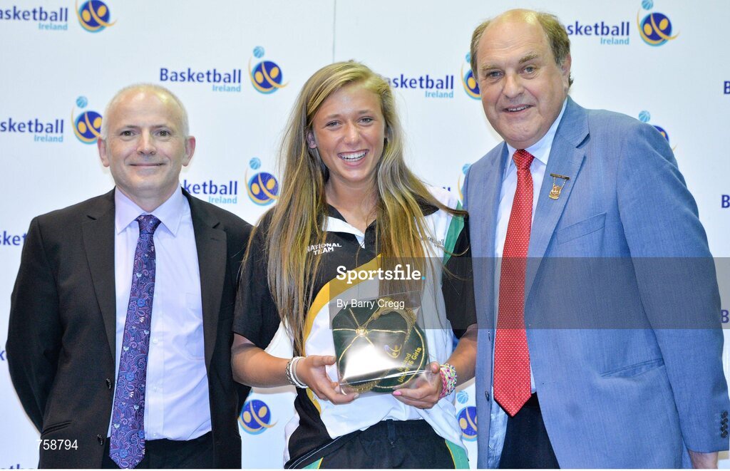 8 June 2013; Kelly Diggin, Cork, is presented with her Under 16 Girl's International Cap by Ger Tarrant, I.A.C, left, and Gerry Kelly, President of Basketball Ireland. Basketball Ireland Annual Awards 2012/2013, National Basketball Arena, Tallaght, Dublin. Picture credit: Barry Cregg / SPORTSFILE