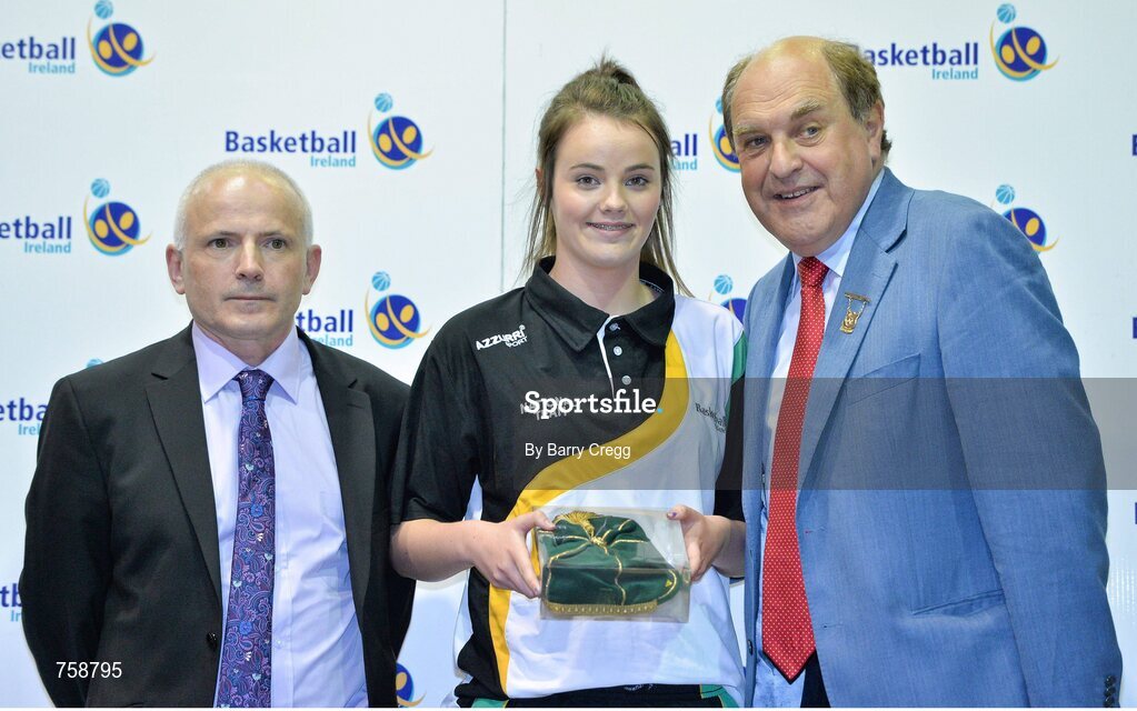 8 June 2013; Olivia Dupuy, Cork, is presented with her Under 16 Girl's International Cap by Ger Tarrant, I.A.C, left, and Gerry Kelly, President of Basketball Ireland. Basketball Ireland Annual Awards 2012/2013, National Basketball Arena, Tallaght, Dublin. Picture credit: Barry Cregg / SPORTSFILE