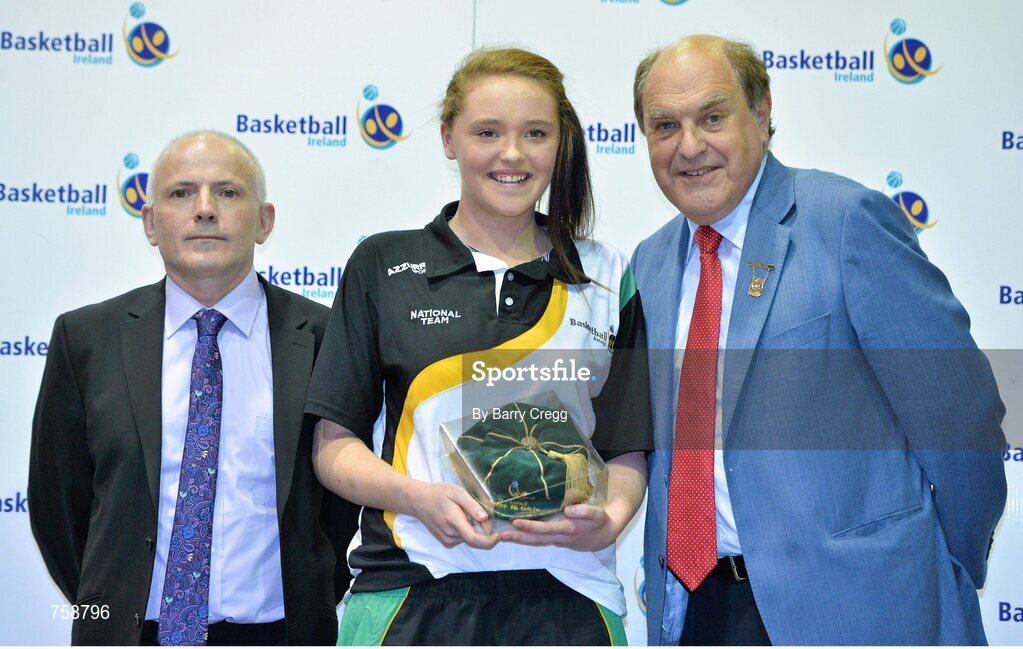 8 June 2013; Shannen Holbrook, Kildare, is presented with her Under 16 Girl's International Cap by Ger Tarrant, I.A.C, left, and Gerry Kelly, President of Basketball Ireland. Basketball Ireland Annual Awards 2012/2013, National Basketball Arena, Tallaght, Dublin. Picture credit: Barry Cregg / SPORTSFILE