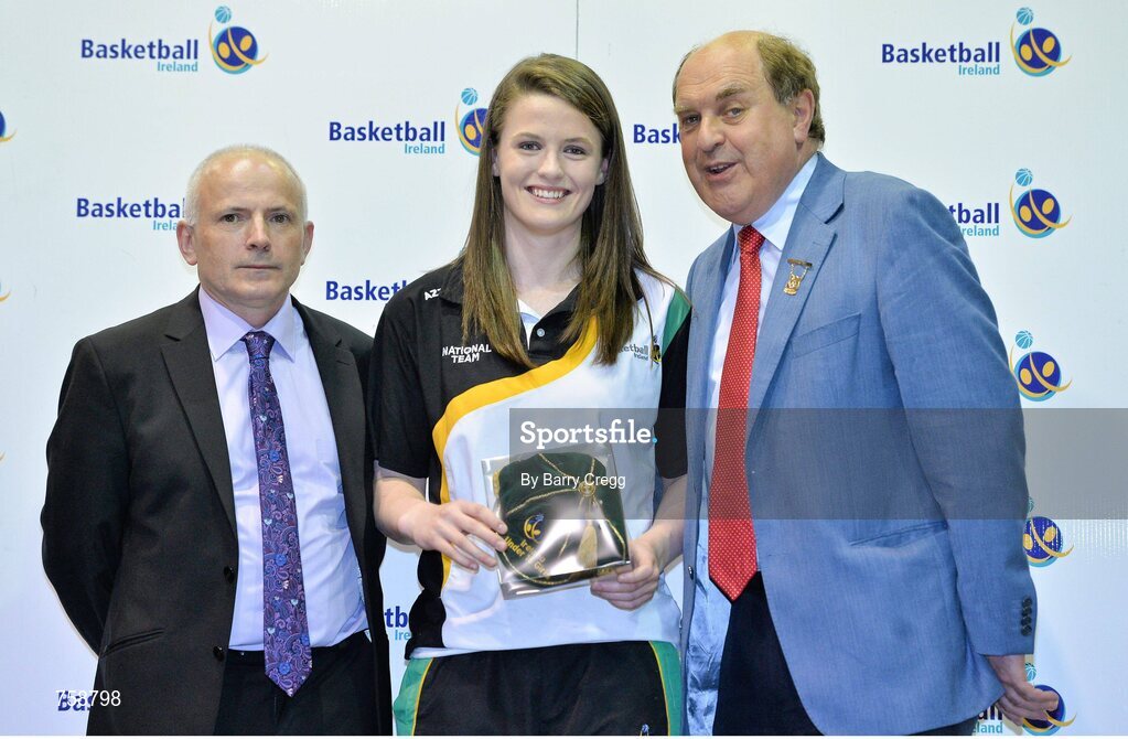 8 June 2013; Aisling McCann, Dublin, is presented with her Under 16 Girl's International Cap by Ger Tarrant, I.A.C, left, and Gerry Kelly, President of Basketball Ireland. Basketball Ireland Annual Awards 2012/2013, National Basketball Arena, Tallaght, Dublin. Picture credit: Barry Cregg / SPORTSFILE