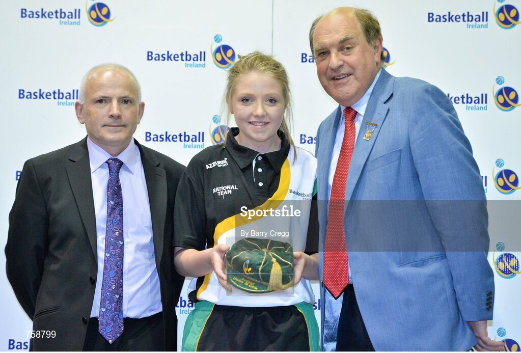 8 June 2013; Sarah Phelan, Laois, is presented with her Under 16 Girl's International Cap by Ger Tarrant, I.A.C, left, and Gerry Kelly, President of Basketball Ireland. Basketball Ireland Annual Awards 2012/2013, National Basketball Arena, Tallaght, Dublin. Picture credit: Barry Cregg / SPORTSFILE