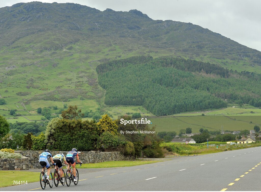 23 June 2013: Matt Brammeier, Champion Systems Pro Cycling Team, leads Philip Lavery, Amicale Cycliste Bisontine, and Philip Deignan, United Healthcare, on the approach to Carlingford during the Elite Men's Road Race National Championships. Carlingford, Co. Louth. Picture credit: Stephen McMahon / SPORTSFILE