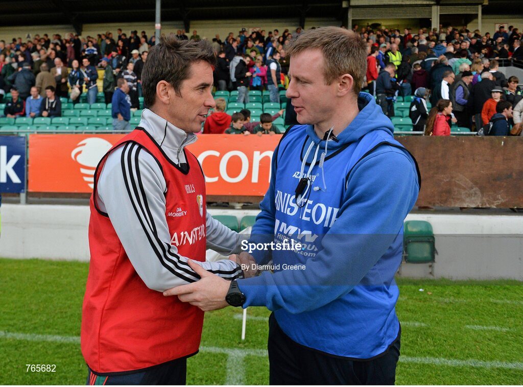 28 June 2013; Carlow manager Anthony Rainbow, left, and Laois manager Justin McNulty exchange a handshake after the game. GAA Football All-Ireland Senior Championship, Round 1, Carlow v Laois, Dr. Cullen Park, Carlow. Picture credit: Diarmuid Greene / SPORTSFILE