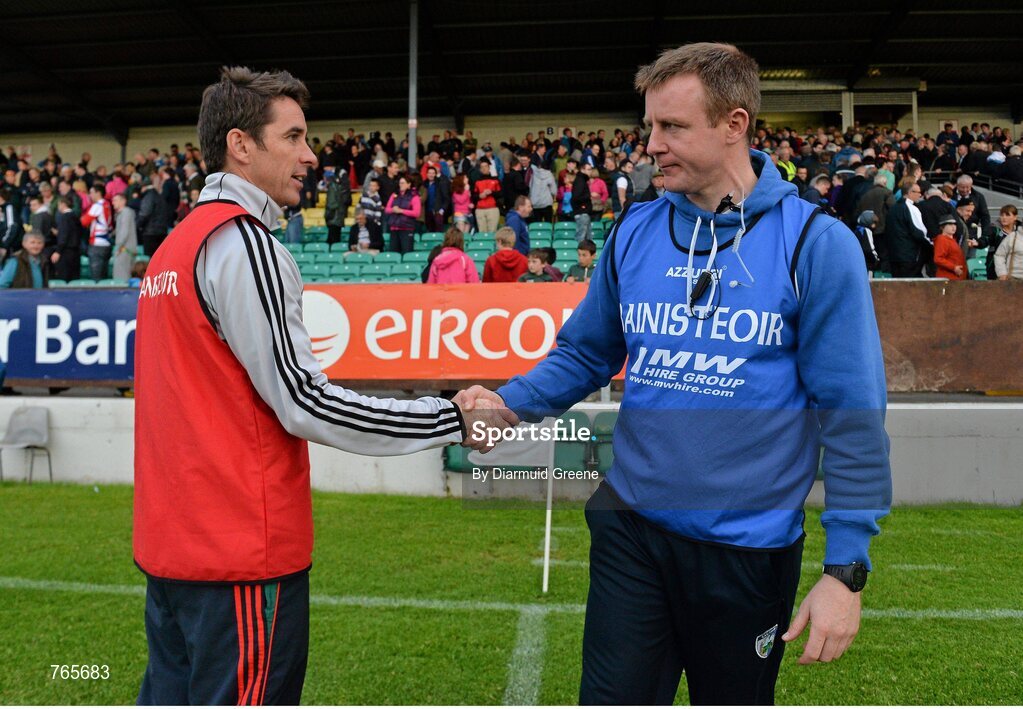 28 June 2013; Carlow manager Anthony Rainbow, left, and Laois manager Justin McNulty exchange a handshake after the game. GAA Football All-Ireland Senior Championship, Round 1, Carlow v Laois, Dr. Cullen Park, Carlow. Picture credit: Diarmuid Greene / SPORTSFILE